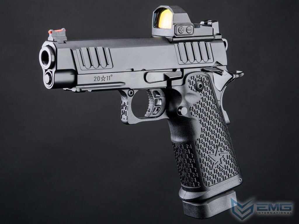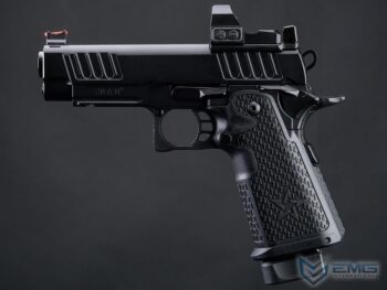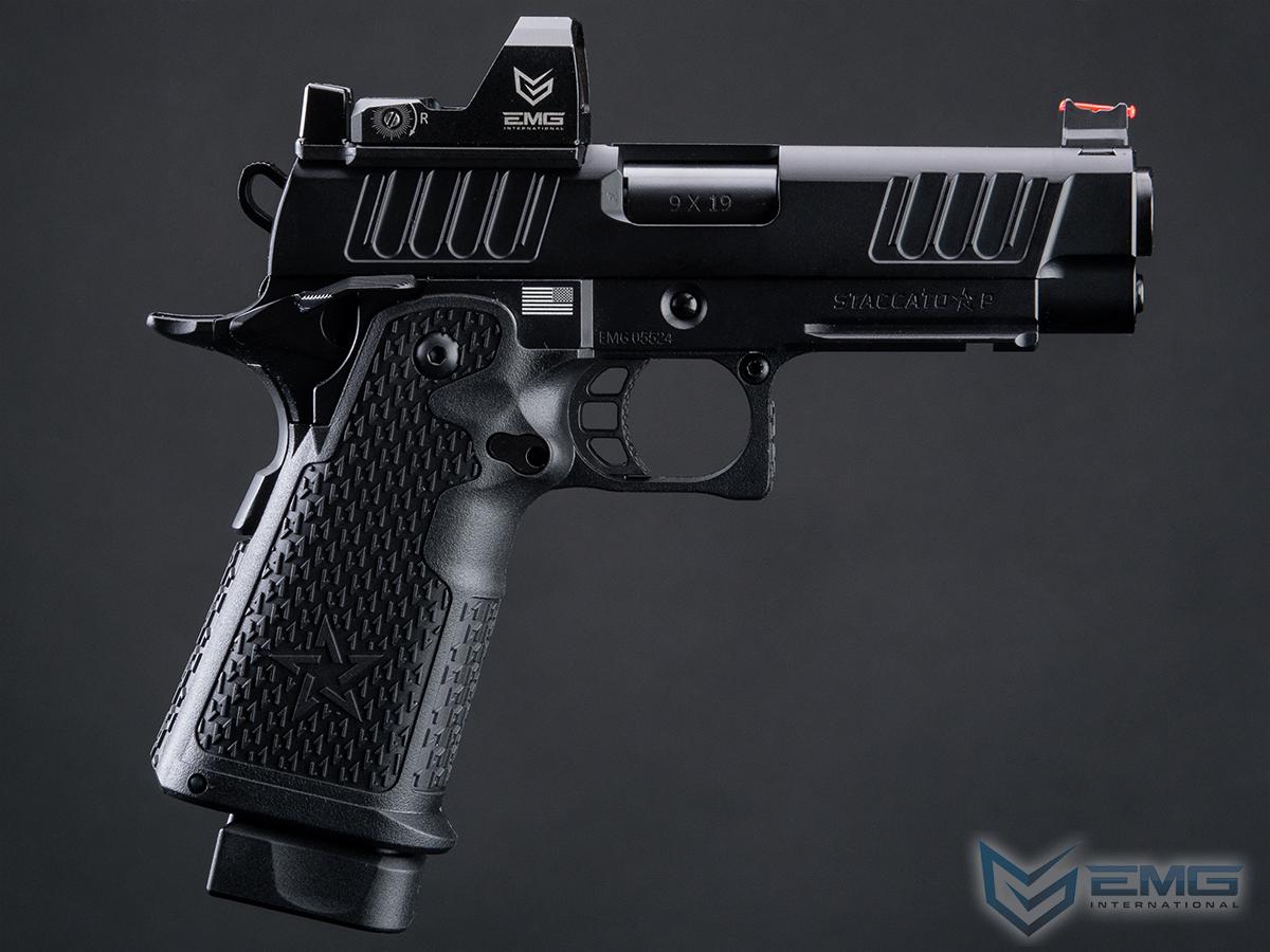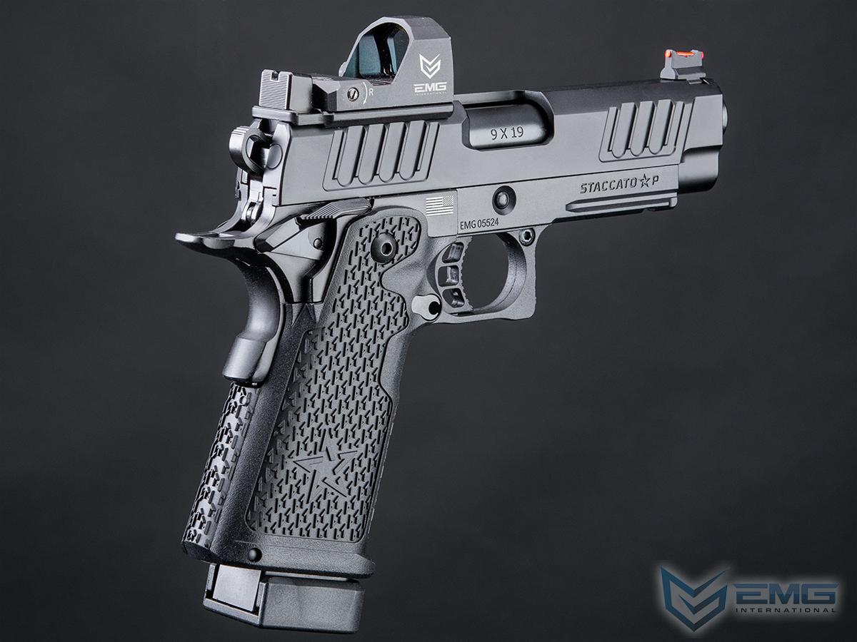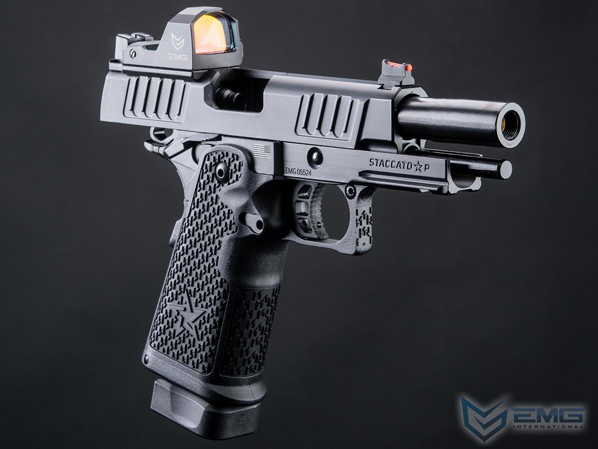 EMG y Staccato colaboran para ofrecer réplicas detalladas de sus pistolas para Airsoft. Staccato, dirigida por veteranos en Texas, ha evolucionado la 1911 a la 2011, usada por más de 1,300 agencias de seguridad. La Staccato P, con cortes en la corredera para mejor agarre, menor retroceso y mayor velocidad, es compatible con miras reflex y tiene un marco de metal con grip texturizado. Las réplicas incluyen logotipos auténticos de Staccato para un realismo máximo.