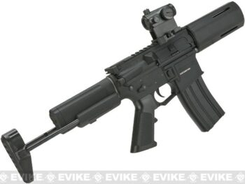 El Krytac Full Metal Alpha SDP es un AEG compacto y ligero, que combina la maniobrabilidad de una pistola con la potencia de un rifle. Fabricado con receptores de aleación de aluminio, tiene un sistema MOSFET integrado, selector de fuego ambidiestro y hop-up ajustable. Su robusta caja de cambios, pistón duradero y motor de alto torque lo hacen ideal para combates en espacios reducidos. Ajustable en longitud de 527 mm a 610 mm y con un peso de 2.5 kg, es perfecto para enfrentamientos rápidos.