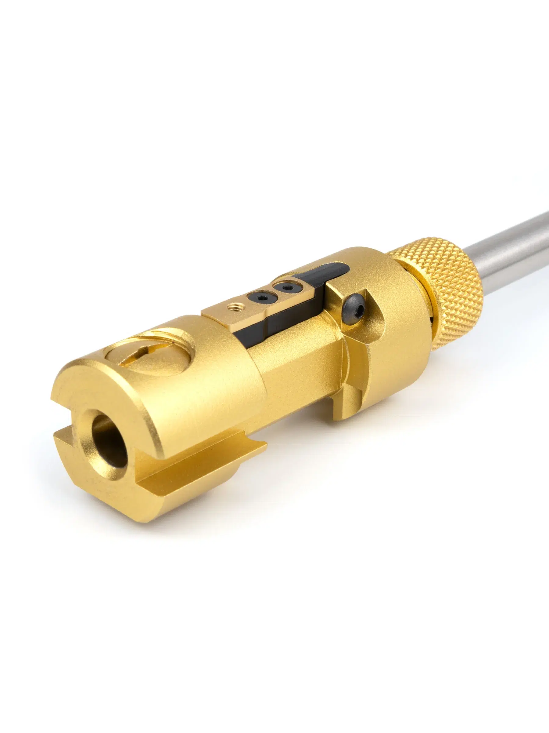 Esta modificación elimina el mecanismo de palanca deslizante del hopup y lo reemplaza con un tornillo de pulgar que empuja hacia abajo desde la parte superior; de esta manera, puedes hacer ajustes de hopup increíblemente precisos y ajustar la trayectoria de disparo a la perfección. No se desajusta.